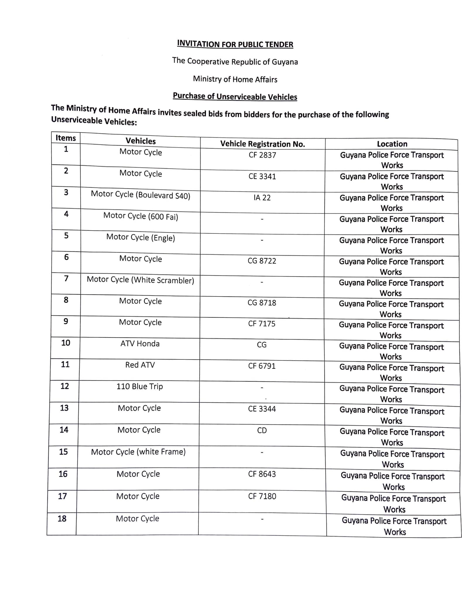 The Ministry of Home Affairs invites sealed bids from bidders for the purchase of the following unserviceable vehicles.