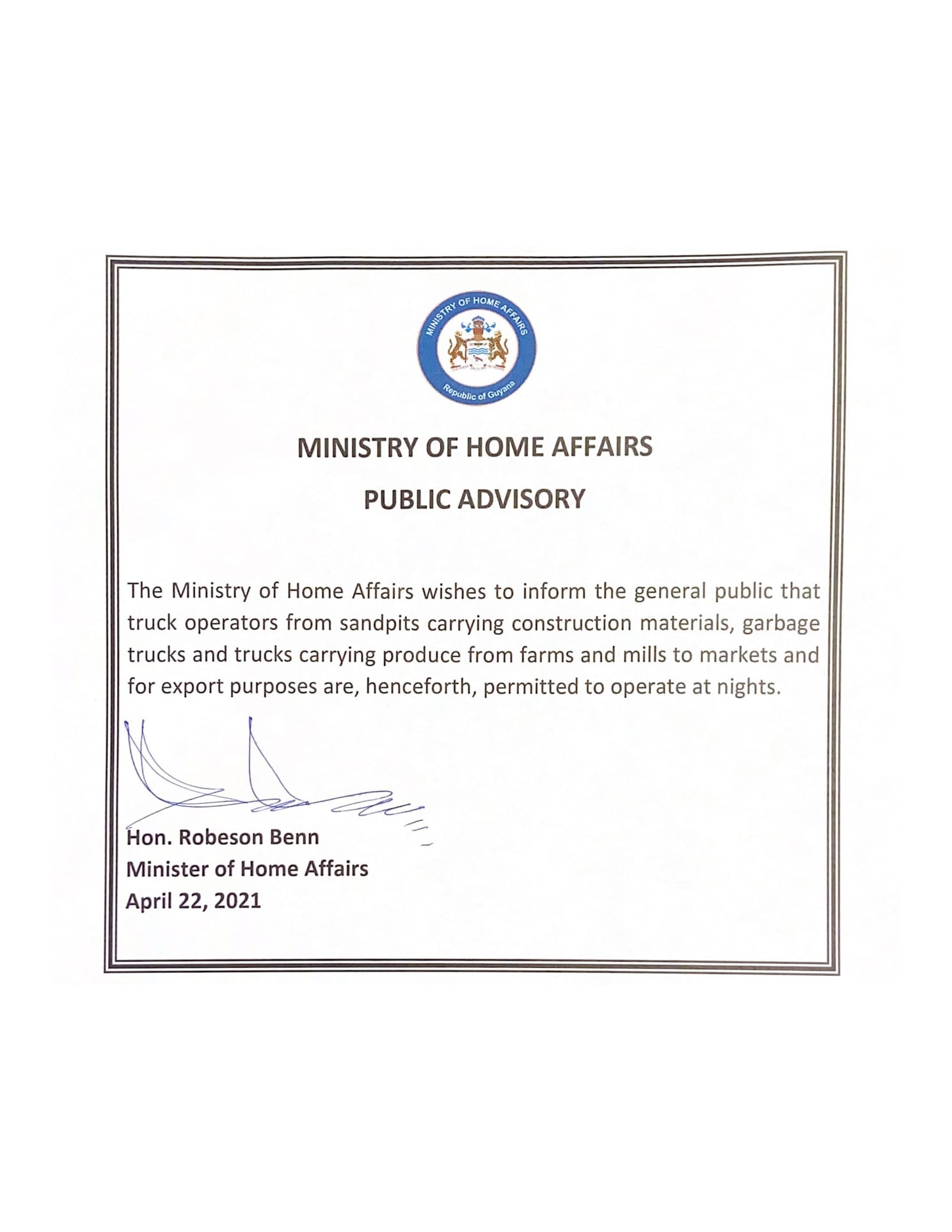 Press Releases Ministry of home affairs Lot 6 Brickdam, Georgetown +592 226-3454 +592 226-1717 Facebook info@moha.gov.gy Lorry Operation After 6PM Press Release April 22, 2021The Ministry of Home Affairs wishes to inform the general public that truck operators from […]National COVID-19 Curfew Press Release April 18, 2021The Ministry of Home Affairs wishes to inform the public of the following notice.« Previous 1 … 10 11 12